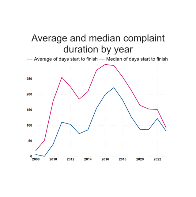 This chart and table show the average a median times complaints took from when the complaint form was received, to when the complaint was closed.