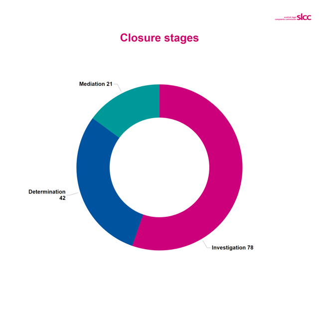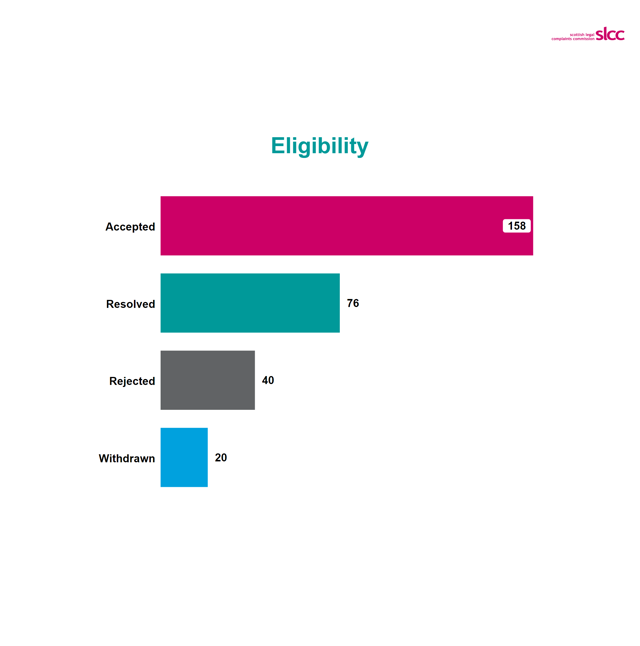 The resolved category includes complaints resolved by the actions of an SLCC investigator before a formal decision to accept or reject the complaint. This includes where the complainer agrees or doesn’t respond to the investigators initial view on the complaint.