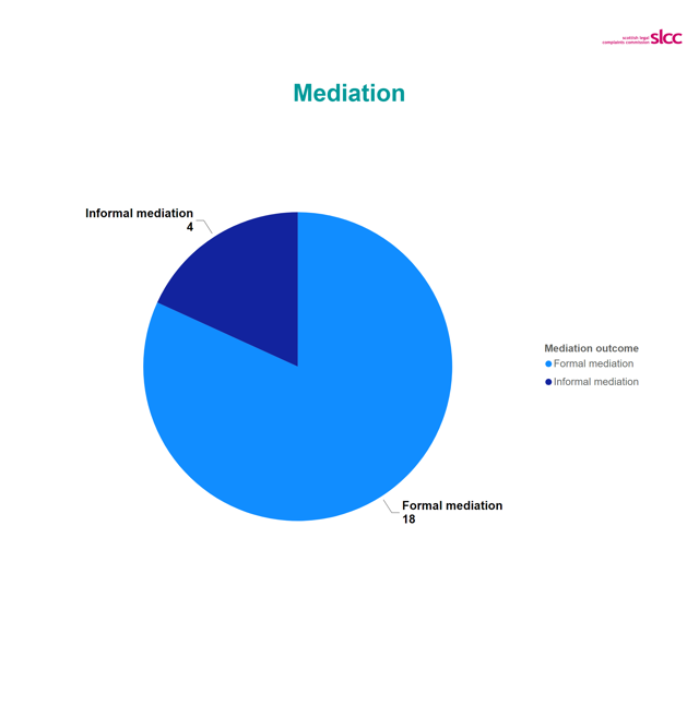 The mediation outcomes are split between complaints settled by a formal mediation meeting and complaints settled by facilitation at the mediation stage.